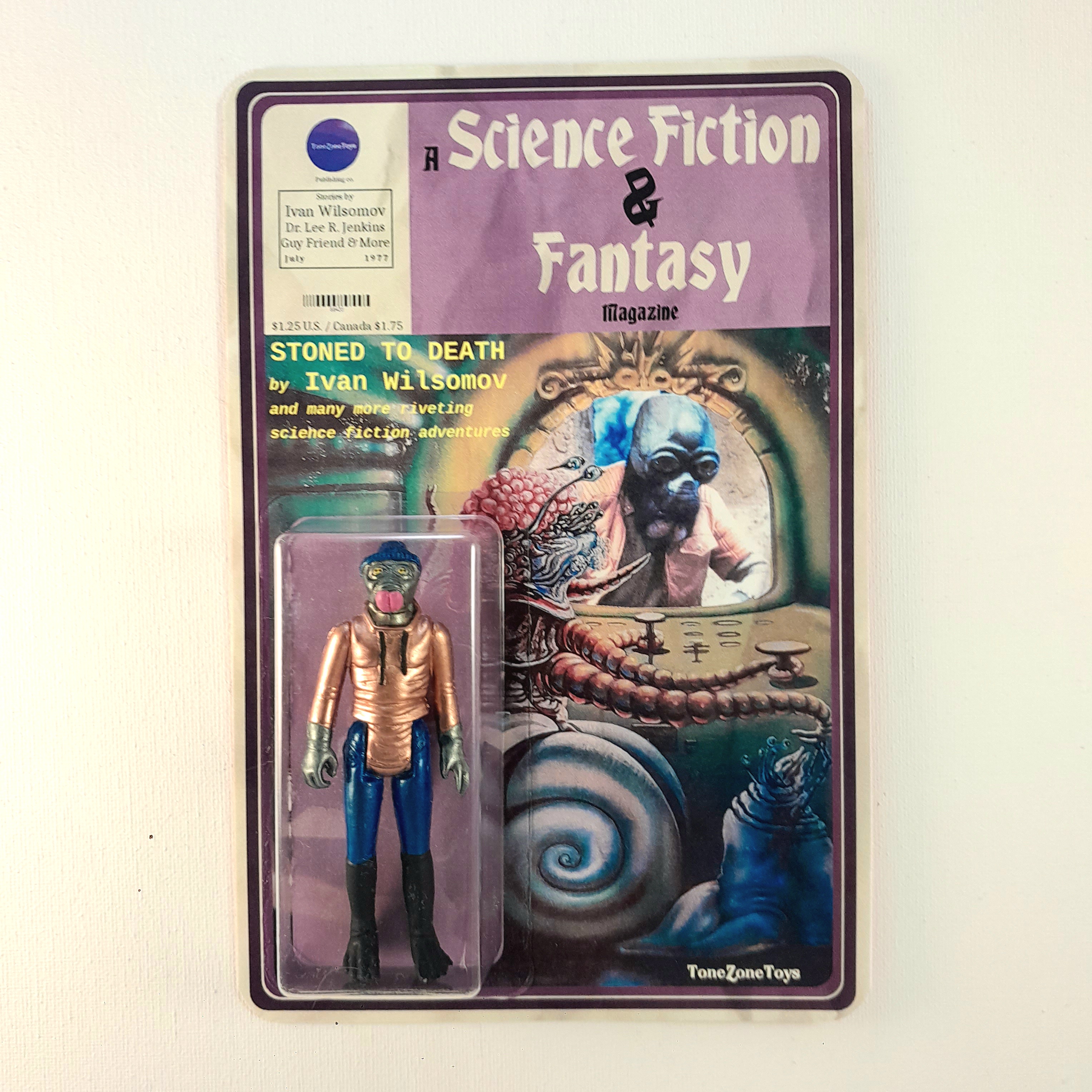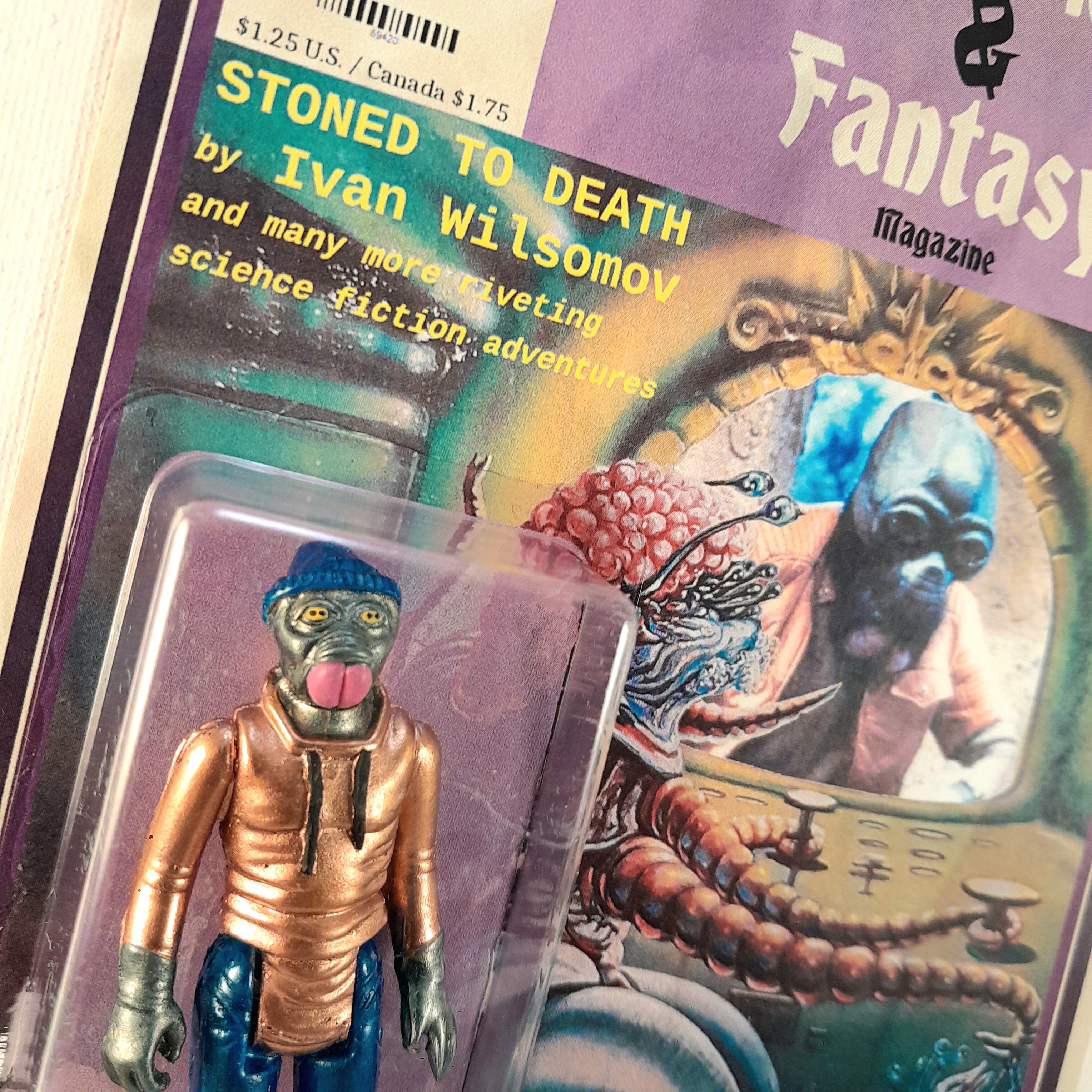 This figure pays tribute to the Magazine of Fantasy and Science Fiction, a pulp fiction publication that began in 1949.